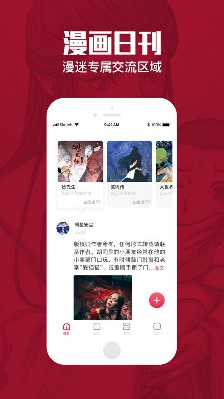 4. 漫画内刊:漫画同好交流、写漫评、晒同人一本漫画是彩条屋旗下的一款以青年向作品为主的原创漫画平台,我们的愿景是坚持给用户提供精品漫画内容,为优质漫画提供一个展示平台。我们致力于为漫画创作者提供优质的连载创作环境,并深耕内容,在IP开发、内容付费领域取得长足进展。