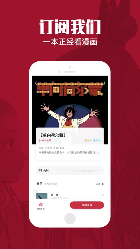 一本漫画是彩条屋旗下的一款以青年向作品为主的原创漫画平台,我们的愿景是坚持给用户提供精品漫画内容,为优质漫画提供一个展示平台。