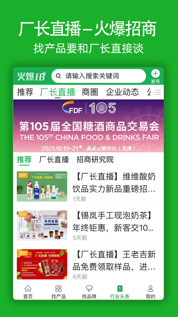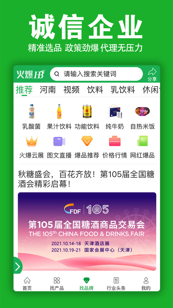 代理好品牌! 掌握最新产品动态,行业优质产品、品牌尽在其中!依需求寻找好产品,依选择代理好品牌!优选诚信企业入驻,免除您的后顾之忧! 您想要的,这里都有!火爆食品饮料网APP,生活、工作尽在其中!
