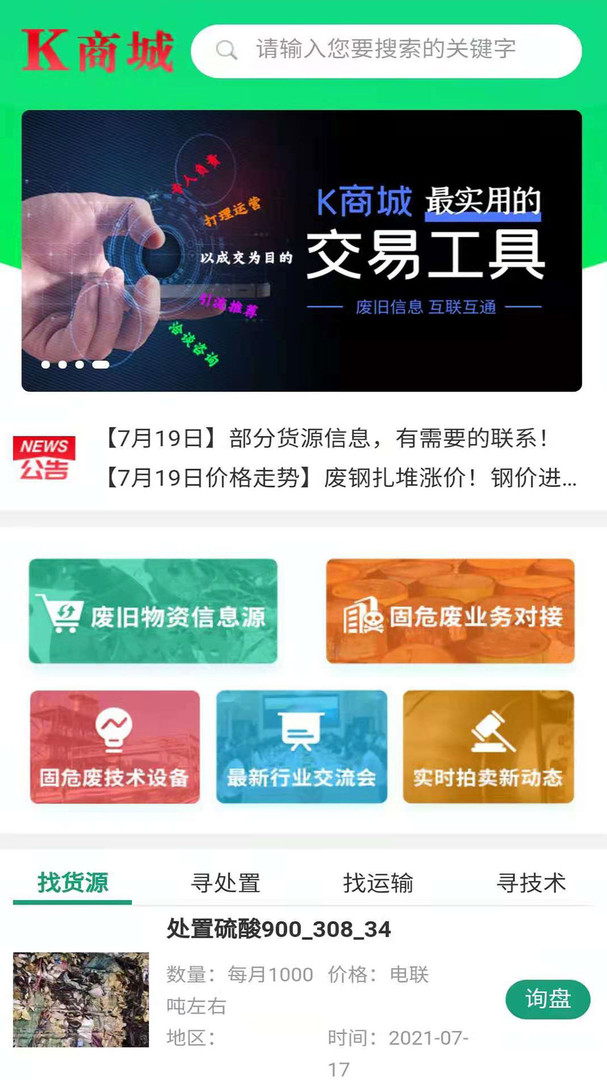 平台专注于再生资源信息的互联互通,设有“废旧物资信息源、固危废业务对接、固危废技术设备、最新行业交流会、实时拍卖新动态”五大功能板块;能够为客户提供废旧物资信息发布、业务对接、产品宣传、技术推广、资产物资拍卖、再生资源行业交流等多项服务。